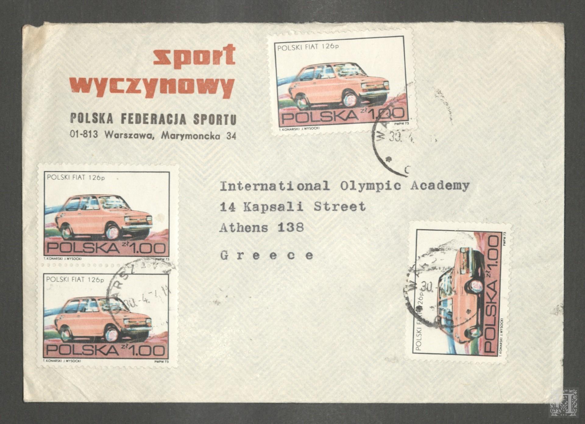 Τίτλος: Ταχυδρομικός φάκελος Πολωνικής Ομοσπονδίας Αθλητισμού με γραμματόσημο της χώρας προς την Διεθνή Ολυμπιακή Ακαδημία