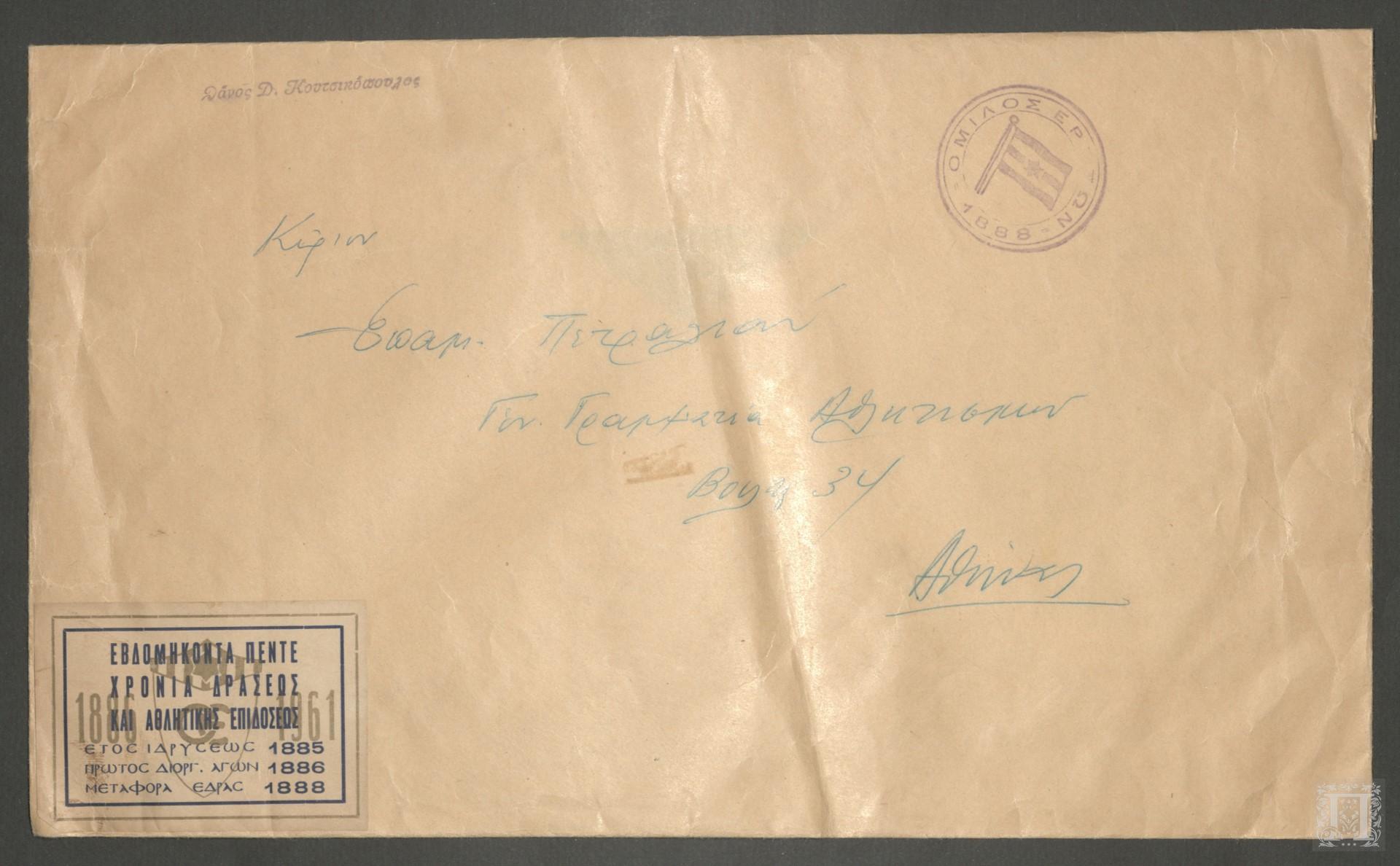 Τίτλος: Ταχυδρομικός φάκελος προς τον Γενικό Γραμματέα Αθλητισμού Επαμεινώνδα Πετραλιά από τον Θάνο Κουτσικόπουλο