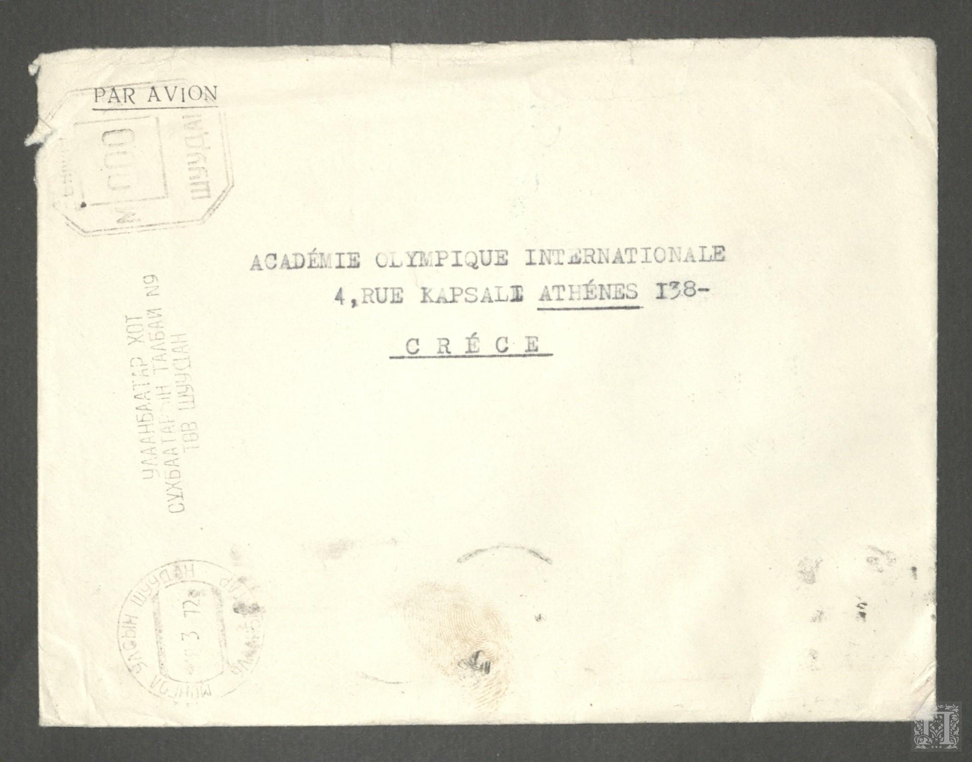 Τίτλος: Ταχυδρομικός φάκελος της Ολυμπιακής Επιτροπής της Δημοκρατίας της Μογγολίας με γραμματόσημο της χώρας προς την Διεθνή Ολυμπιακή Ακαδημία