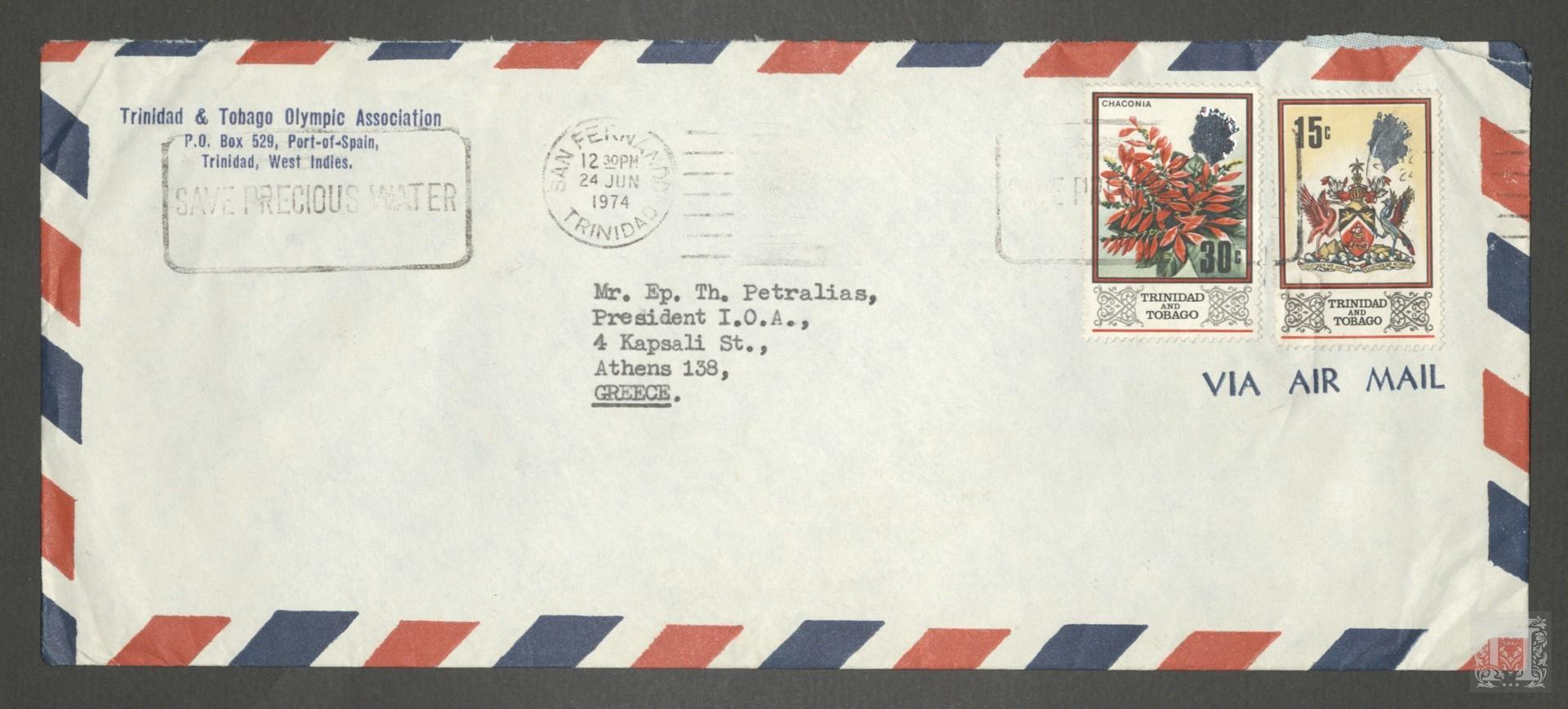 Τίτλος: Ταχυδρομικός φάκελος με γραμματόσημα από το Τρινιντάντ και Τομπάγκο προς τον Επαμεινώνδα Πετραλιά