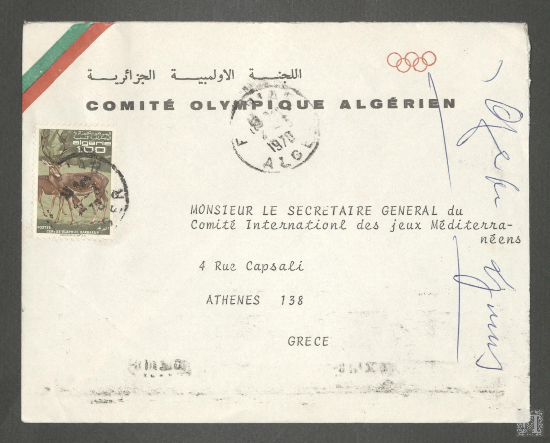 Τίτλος: Ταχυδρομικός φάκελος με γραμματόσημο από την Αλγερία προς τον Γενικό Γραμματέα της Διεθνής Επιτροπής Μεσογειακών Αγώνων