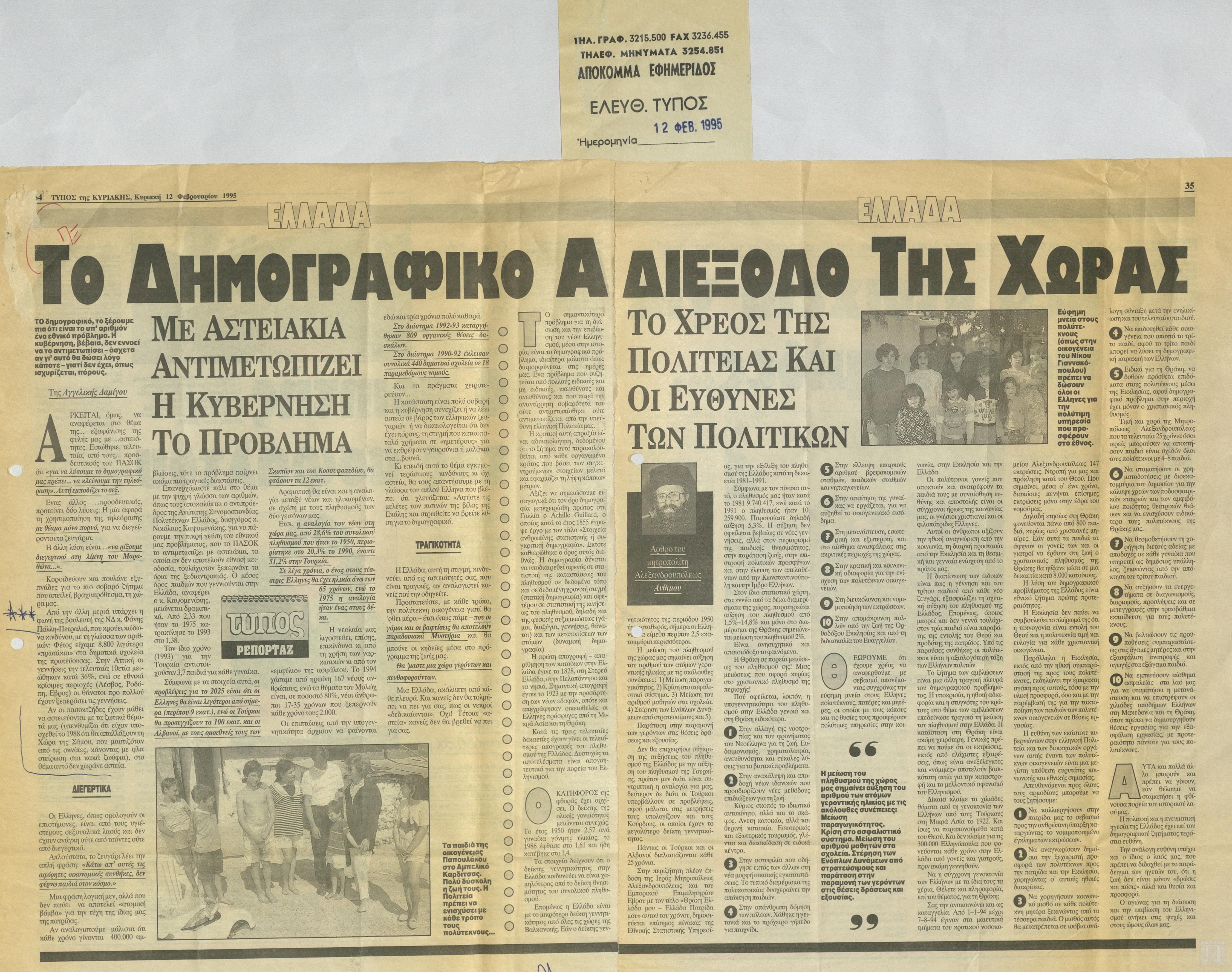 Τίτλος: Απόκομμα εφημερίδας: Το δημογραφικό αδιέξοδο της χώρας, (Ελεύθερος Τύπος, 12 Φεβρουαρίου 1995)